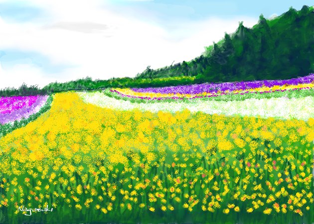 正雄です 今日も名古屋は気温が上がり35度を越えたようです 昨年の夏にお兄さんご夫婦、貴弘さんと出掛けた北海道の富良野を描いてみました 花のラインが綺麗に出来ています 涼しかった風を思い出しました -