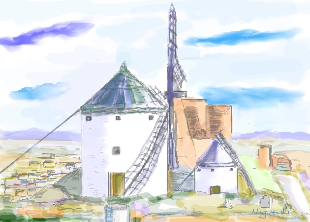 先頃 スペインへ行ってきました 冗談ですよ~ ドン・キホーテーで知られている ラ・マンチャ地方です 爽やかな風に風車が回っています 遠くに街並みが見えます 一度行きたい場所です -