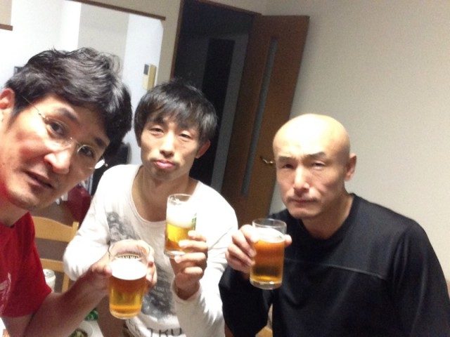 那須と奈良から来客。 もちろん、格闘技の仲間です。 真ん中は、先日プロ選手としてデビューして、デビュー戦を勝利で飾った35歳の選手。 ちょっと、おっちょこちょいだけど、憎めないかわいい奴です。 右側は、那須から。 スキンヘッドで怖い顔してるけど... -