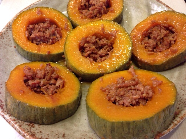 最近、だ〜れも投稿してくれなくなったので、ちょっと書いてみます。 実家からもらった、かぼちゃ。 宿儺南瓜(すくなかぼちゃ)という細長いかぼちゃです。 輪切りにして、ダシとみりんと醤油で煮込み、みりん、醤油、ショウガで味付けをした鳥のミンチを...