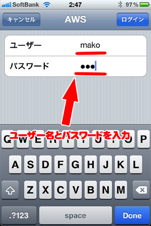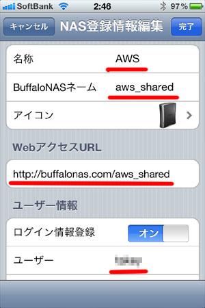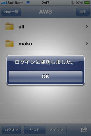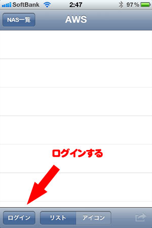 ▼NAS一覧の画面から、上で作成したAWSをタップして、ログイン。