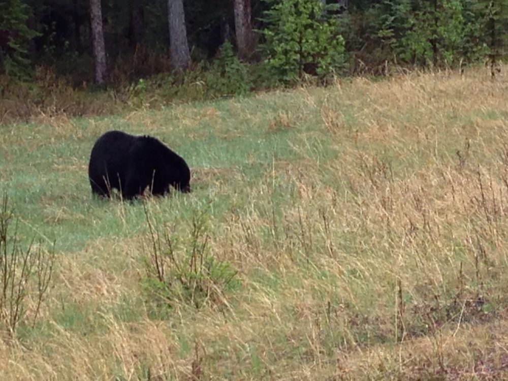 上からマリン湖2枚、ジャスパーの駅に置いてある機関車、食堂のそばで、コロンビア大氷原の雪上車で、ジャスパーへ帰る途中の景色、同じく途中で出会った熊ーー5mくらいの至近距離で…