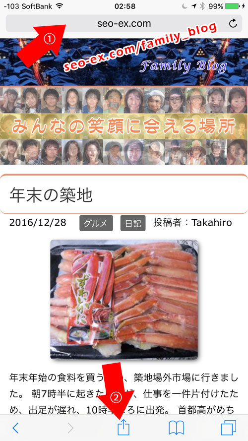 ①まず、Safari のアドレスバーに fblg.seo-ex.com と入力して、ファミリーブログを表示します。