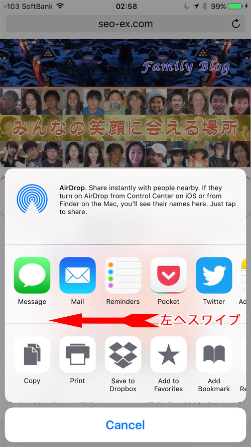 「ホームスクリーンに追加」というアイコンまで、スワイプします。