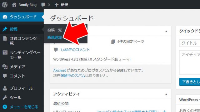ここから、「投稿」⇒「新規投稿」を選択すれば、投稿できます。