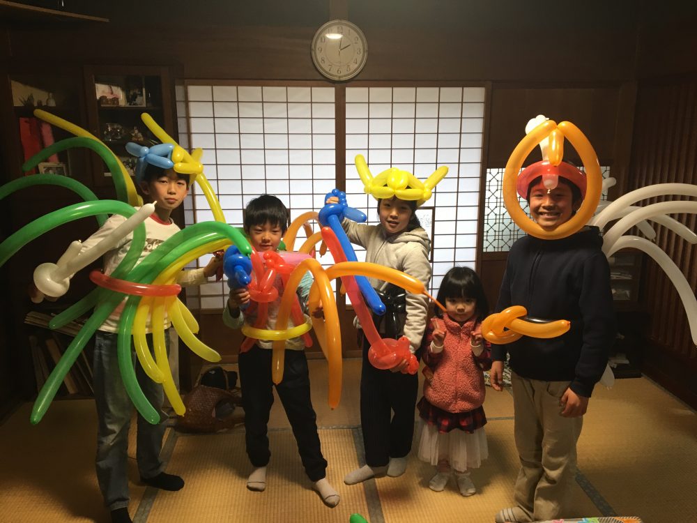 先日、久居の実家に行った時のこと、相変わらずちびっこたちは一通りゲームで遊んだあと、おにごっこやサッカーを楽しみ、最後は義妹が教えてくれたバルーンアートで、剣やハートや兜などを作りながら大はしゃぎでした。