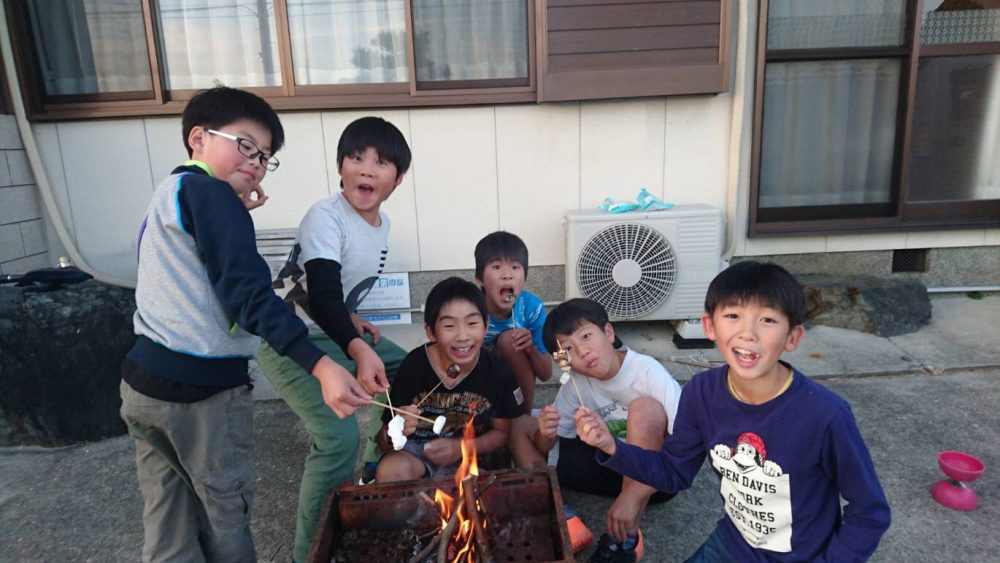 友達の家で焚き火をしながら焼きマシュマロを堪能する息子。