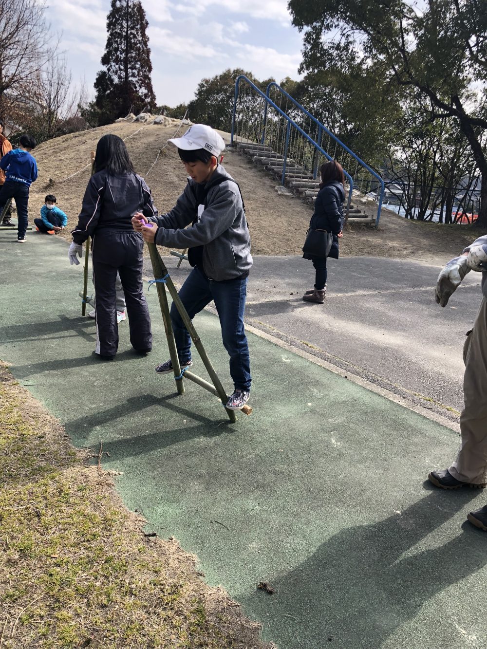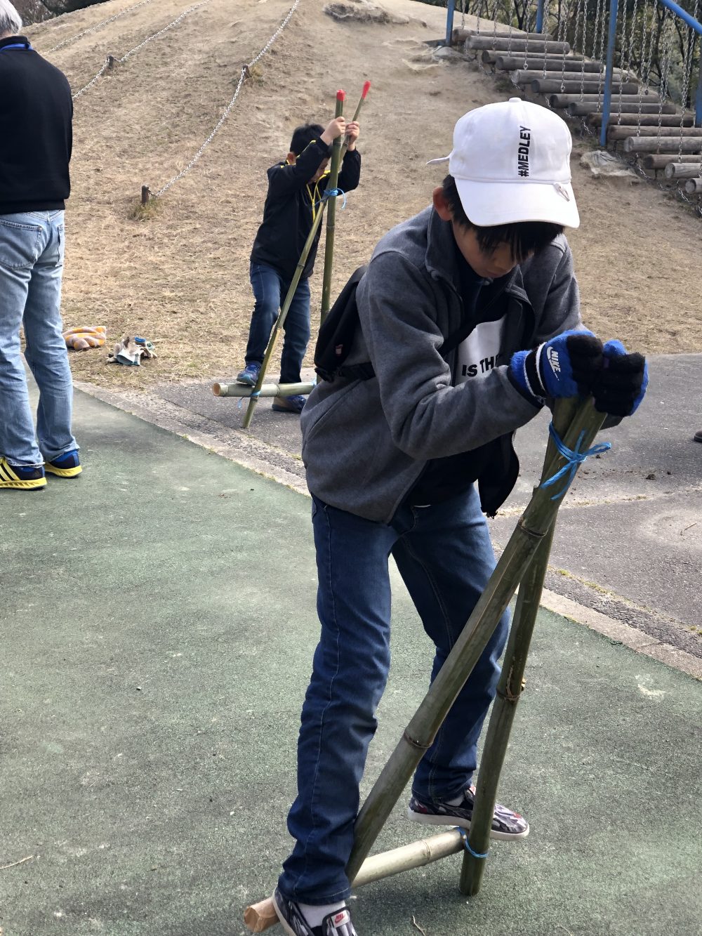 のこぎりで竹を切り、木ネジと紐を使って固定。