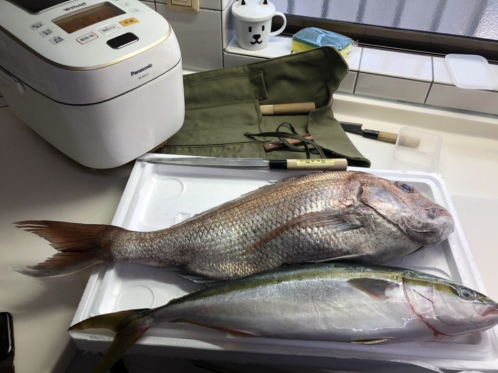 彩陽が夏休みを我が家で1週間過ごす事になったが浪人生の為1日くらいは外出するもあとは勉強、勉強です。22日土曜の夜先陣として浩起が来宅。写真の様な鯛67cmとハマチ57cmを豊浜で仕入れてきました。4時から6時頃迄かかって2匹とも3枚におろしてくれました。包丁は大小の出刃と刺身包丁を持参して。刺身、煮付、焼き物、あらの処理等々で持参の焼酎と小生の沖縄の43度の泡盛で乾杯でしたが早々にダウン。取り敢えずご報告です。