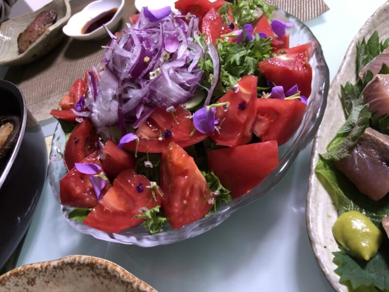 トマトとかき菜と食用花をゆかりの友達がくれたので、そこにオニオンを加えて、彩り豊かなサラダ。
