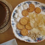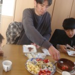 1週間ほど時間差がありますが、我が家でもチョコフォンデュをしました。以前お兄ちゃんが書いたように、バナナとお餅が最高ですね。他に試してみようということで、フルーツ以外のところでマシュマロ、サツマイモ、チーズ、カシューナッツなども試してみました。マシュマロは甘党の人にはおすすめ、さつまいもはチョコに負けて味があんまりしませんでした。今度はレーズンなどのドライフルーツ、クッキーも試してみたいです。カロリーが高そうだったので、お昼ごはんとしてやりましたが、博パパと傑にはかなりのブーイングでした。1時間後にはみんなでラーメンを食べ、やっと納得してもらいました。